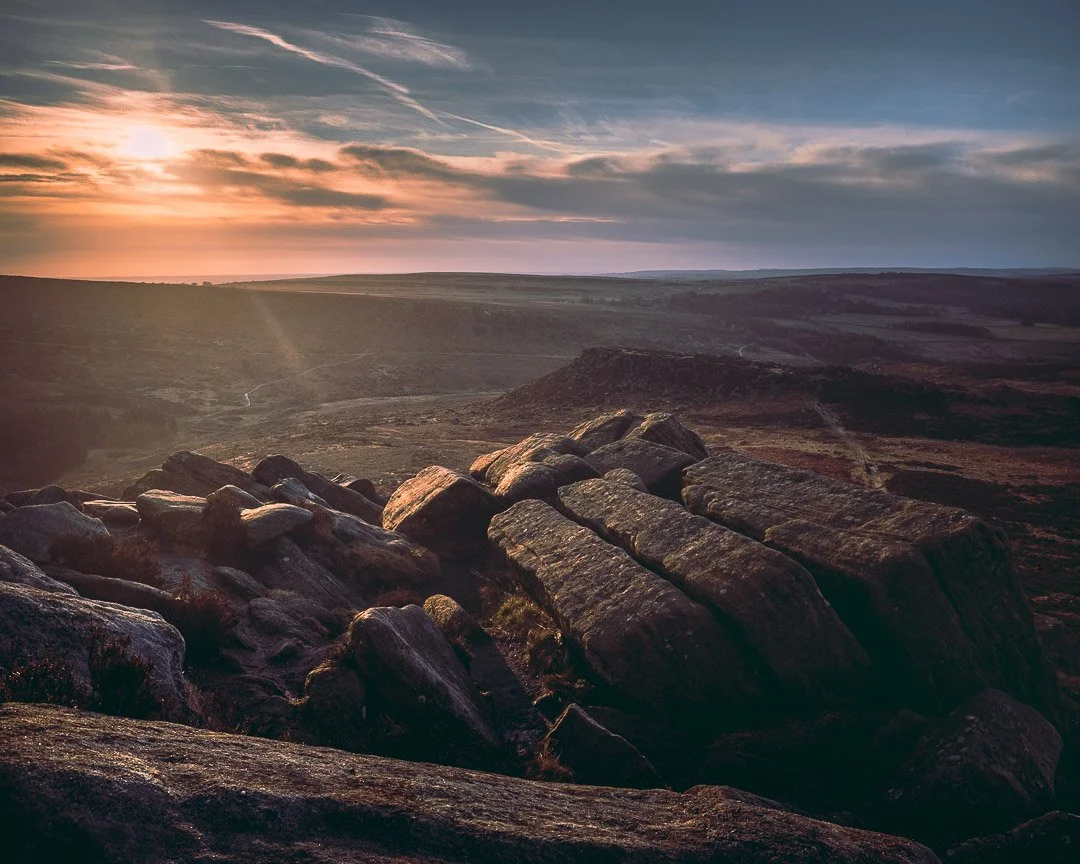 View from Higger Tor at Sunrise. Surprise View is on the right hand side and, lurking in the shadows beyond, is the top end of Padley Gorge